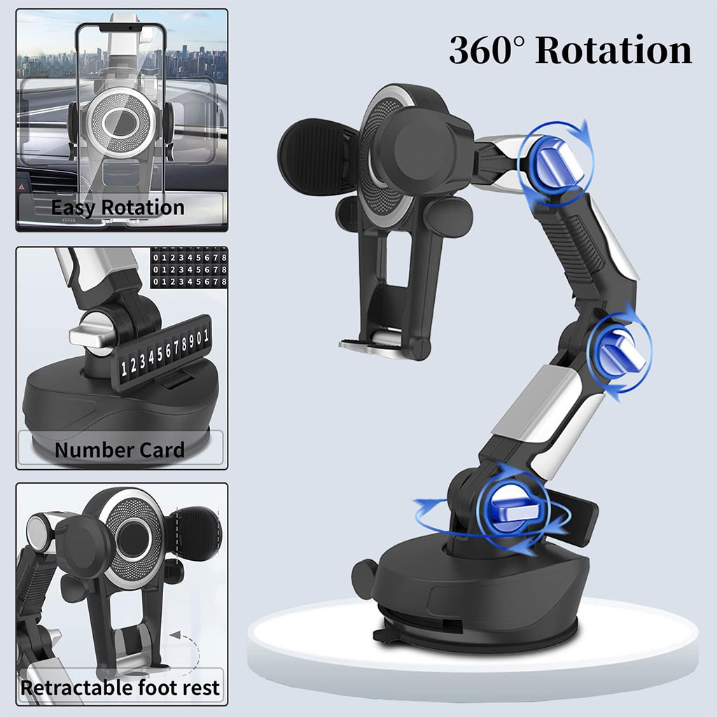 ⭐ المميزات الرئيسية :🔄 دوران كامل 360° : تحكم في زاوية الرؤية كما تحب.📱 متوافق مع جميع الهواتف : يدعم الهواتف الذكية حتى 6.8 بوصة.🛡️ ثبات قوي : أذرع مضادة للانزلاق + نظام قفل بالمسمار لضمان ثبات حتى في الطرق المهزوزة.📏 ذراع تلسكوبي قابل للتعديل : يتمدد وينحني حسب حاجتك، مثالي لاستعمال الـGPS أثناء القيادة.🧲 قاعدة شفط قوية : تثبيت آمن على الزجاج الأمامي أو لوحة القيادة.⚡ تركيب سهل بدون أدوات : قابل لإعادة الوضعية في أي وقت.🎯 مثالي لـ :